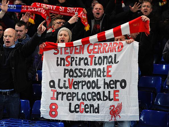 Liverpool Foot Ball Club fans show case a banner to support their Captain fantastic Steven Gerrard at Standford Bridge yesterday night during the second leg Capital One Cup match.